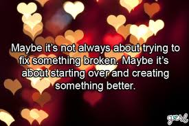This is a great quote, and so true, because at some point we cannot fix what is broken, it breaks so many times it is impossible, and we are just left with a complex mess of a thousand pieces, this is not and should not be our life, we can start again and learn from our mistakes if necessary, Never be afraid or ashamed to start a new life, we all deserve the best and we don’t always find it at the moment, we have to wait for the right moment to come along, everything we do in life, is for a reason, at times we find this hard to comprehend, but somewhere, somehow there is a lesson to be learnt from what we go through, no matter how hard it may be at the time, you do not need to find this instantly, take your time let your thoughts and intuition work for you, just remember that when you choose a new path, a new journey, keep going one step at a time……………………….